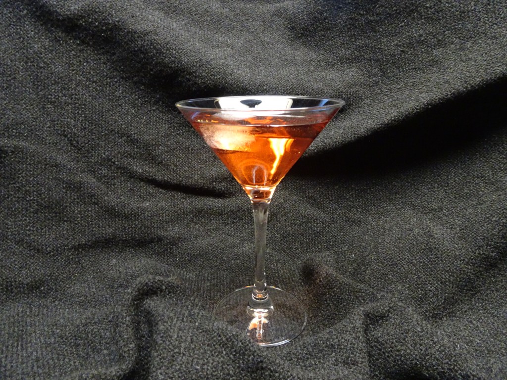 Stir ingredients with ice and strain into a cocktail glass, add one ice cube.